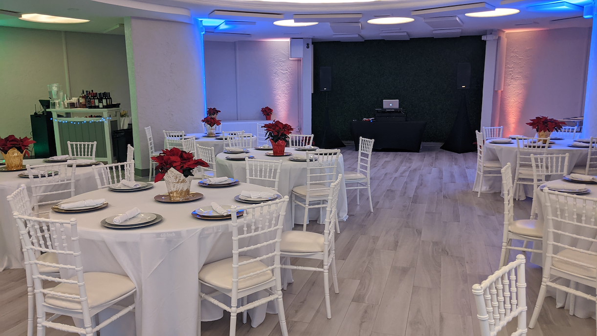 With your rental and food & beverage minimum: Tables including 6ft. 8ft, Banquet rounds, high-top tables, Chiavari chairs, café string lighting, white linens and all dinnerware. Bronze or Silver chargers with white plates. Event Staff including Servers, Bartenders, Venue Coordinator.